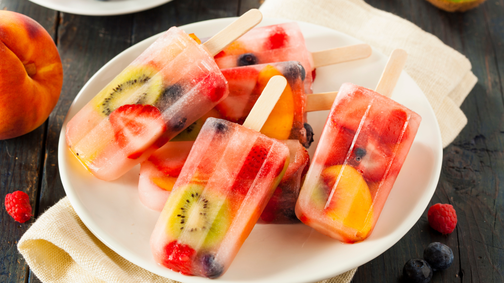 Despeje o chá em forminhas de picolé, adicione as frutas e congele. Um lanche saudável para espantar o calor!